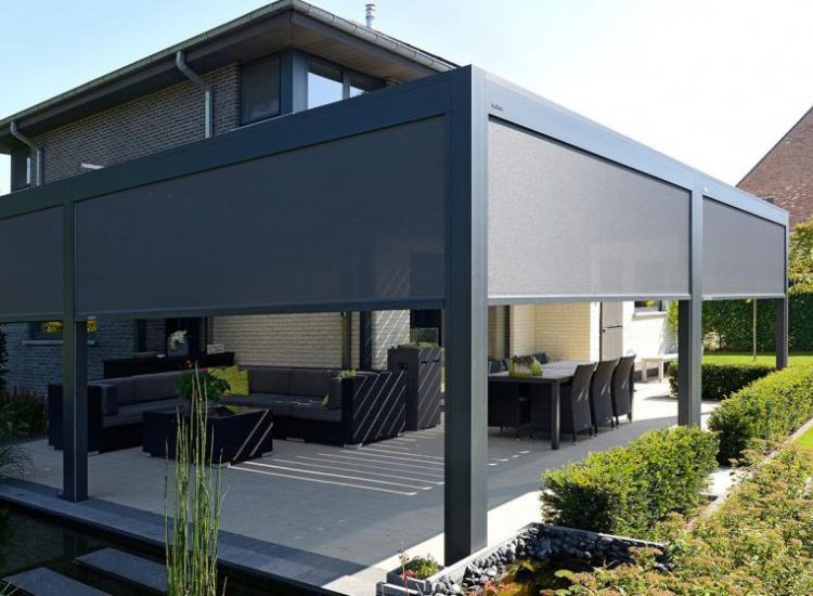 Ein Dach mit einem schiebbaren FaltdachFür das Faltdach können Sie aus einer Reihe strapazierfähige Stoffe wählen, die gegen Regen, Wind (CE-Windklasse 2) und Schmutz beständig sind. Eine Neigung ist nicht erforderlich, wodurch ein flaches und horizontales Design gewährleistet ist. Die Schrauben sind nicht sichtbar und Regen läuft über angeschlossene Regenrinnen in den Pfosten.