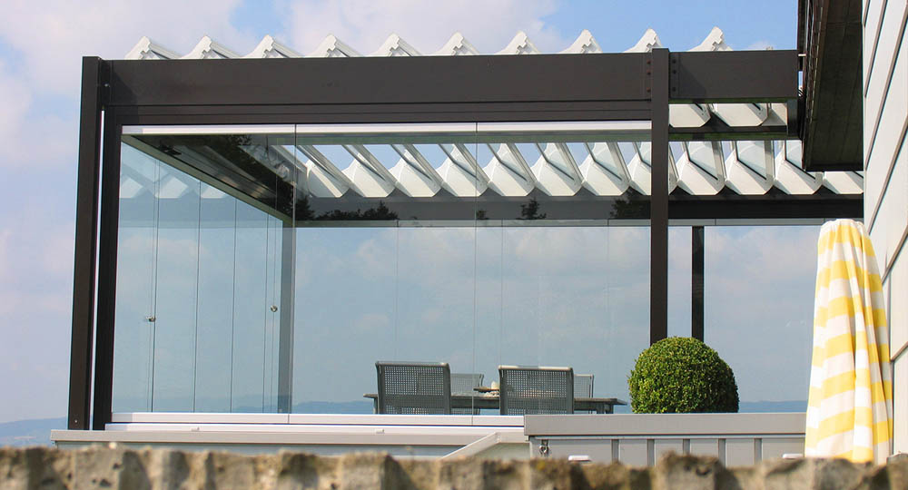 Robuste, drehbare Lamellen aus Aluminium und Verbundssicherheitsglas Aufklappen der Lamellen zur Temperaturkontrolle (erwärmte Luft entweicht, kühlere Luft zieht nach) Regen- und schneedicht wie ein Ziegeldach dank überlappender Lamellen Optionale Rundumverglasung mit faltbaren Glasschiebewand-Elementen Eine Rundumverglasung bietet zusätzliche Lüftung im Sommer und Witterungsschutz im Winter -